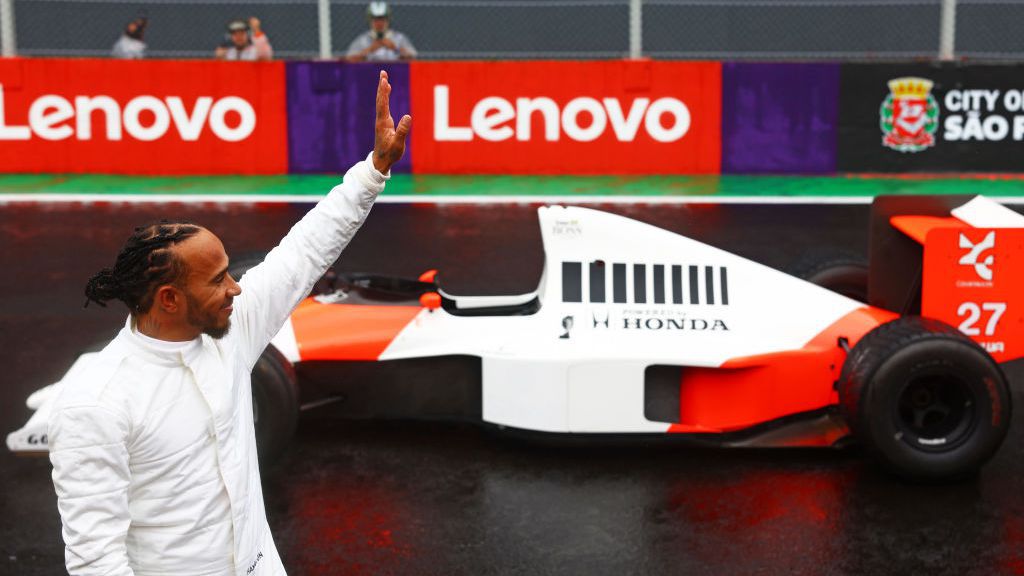 7-кратният световен шампион във Формула 1 Люис Хамилтън изправи на крака феновете по трибуните на „Интерлагос”, след като излезе на пистата с шампионска Макларън на легендата Айртон Сена след квалификацията днес. Британецът, който е и почетен бразилски гражданин, кара с една ръка болида МР4/5В, тъй като с другата държеше бразилското знаме.