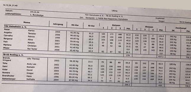 Олимпийският, световен и европейски шампион по вдигане на тежести Карлос Насар набра 210 точки в старта на неговия Хайншайм в Бундеслигата на Германия, но тимът отново загуби, след като Рьодинг завърши със 738,2, а отборът на Карлос само 706,1.