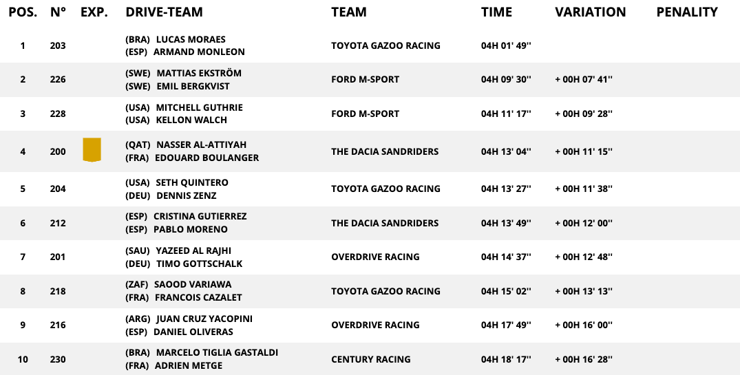 Мораеш успя да стигне до финала за малко над 4 часа, финиширайки с време от 4:01:49. По този начин той победи с цели 7:41 минути Матиас Екстрьом от М-Спорт, а тройката с пасив от 9:28 оформи съотбирникът на шведа Мичъл Гътри.