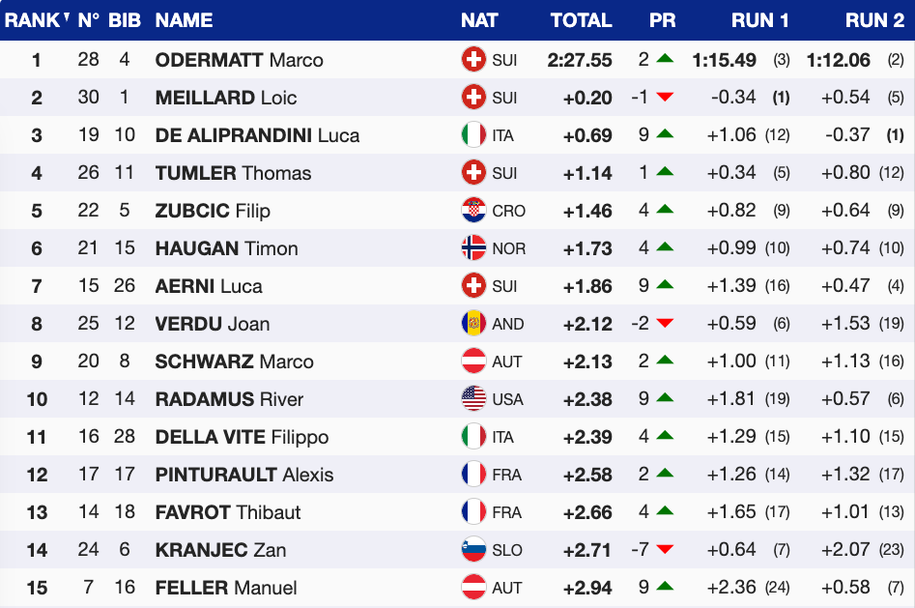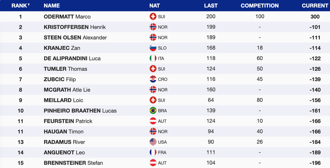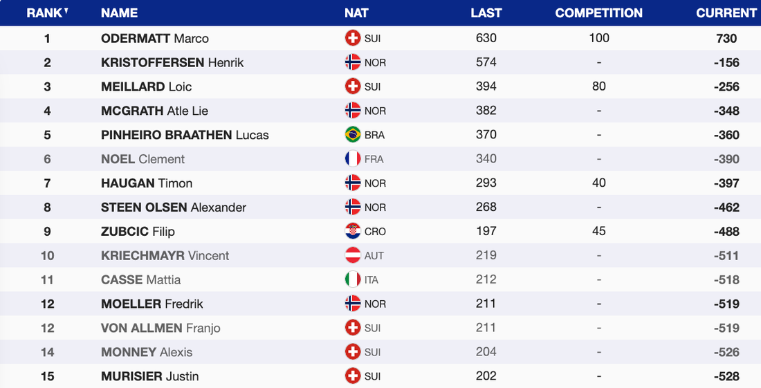 За Одермат това е пета победа от началото на сезона и с нея той увеличава своя аванс на върха на генералното класиране с актив от 730 точки и преднина от 156 пред Кристоферсен. Трети с пасив от 256 пункта е вторият от днес Меяр.