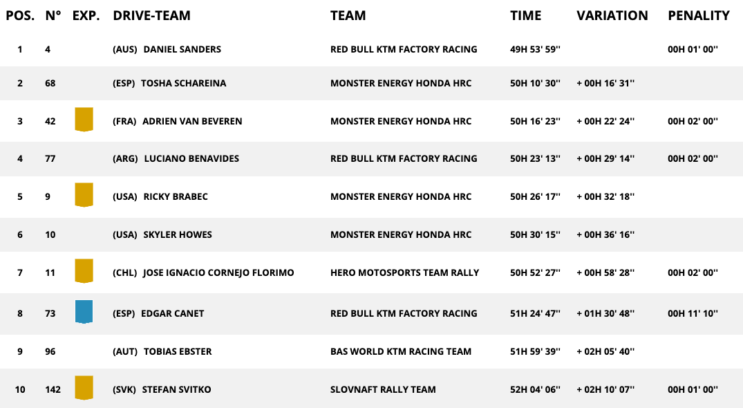 От фаворитите за победата в рали „Дакар“ най-напред завърши лидерът в генералното класиране Даниъл Сандърс (КТМ), който даде 11-то време, изоставайки с 8:22 от Дохърти. Днес австралиецът успя да прибави 1:46 към своя аванс пред Тоша Шарейна и така преди финалните два етапа води с 16:31 пред пилота на Хонда. Трети с общ пасив от 22:24 е Адриен ван Беверен (Хонда), който днес загуби 2:03 от Сандърс.
