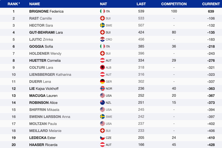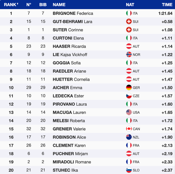 С четвъртата си победа за сезон Бриньоне увеличи своя аванс на върха на генералното класиране в Световната купа, в което с актив от 639 точки тя води със 109 пред швейцарката Камий Раст. Тройката с изоставане от 132 пункта оформя Сара Хектор (Швеция), която подобно на Раст не участва в скоростните дисциплини.