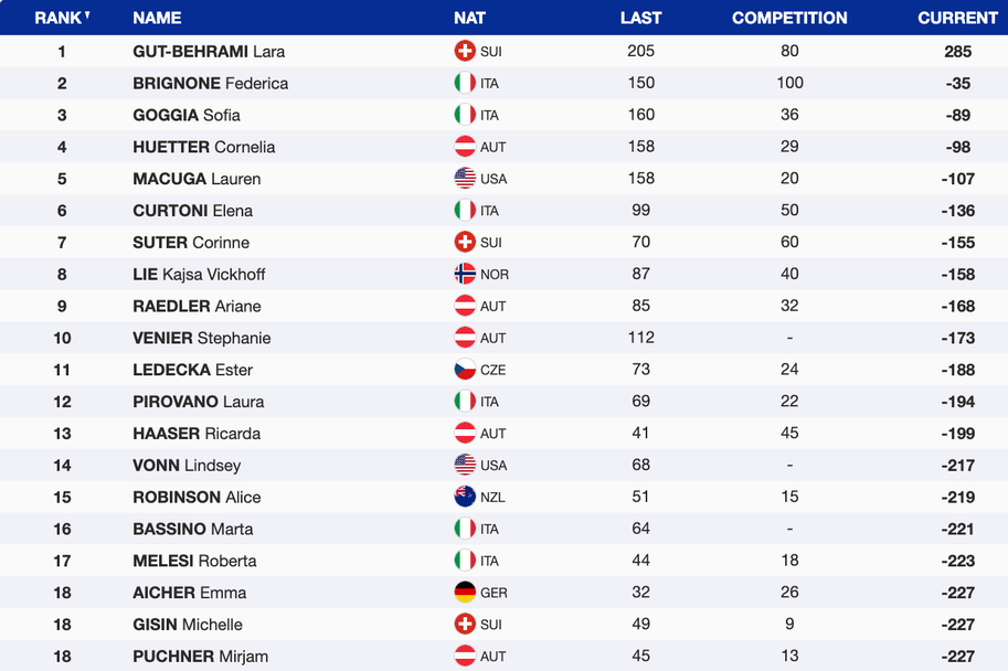 В битката за малкия кристален глобус в супергигантския слалом начело с 285 точки е Гут-Бехрами, втора с изоставане от 35 е Бриньоне, а четвърта на 89 зад водачката е Годжа.