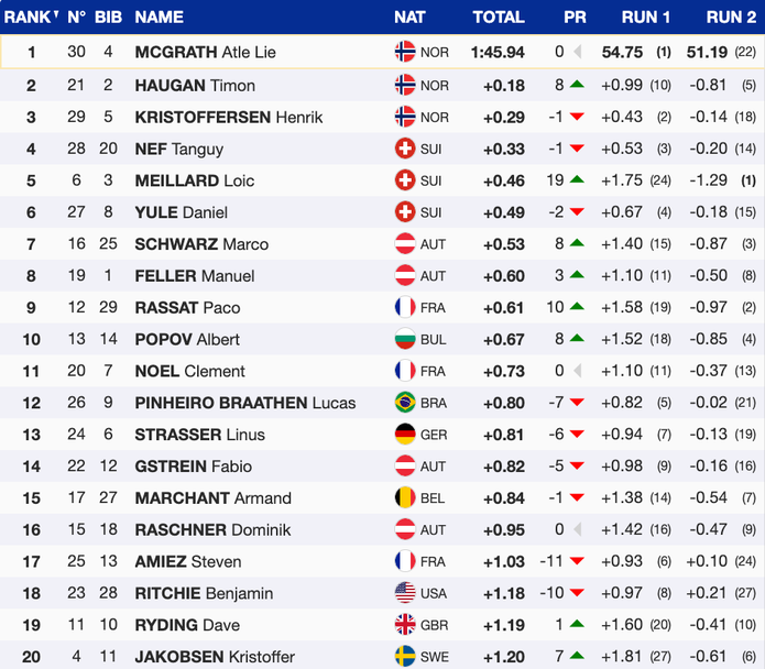 Победата днес грабна норвежецът Атле Лий Макграт, за когото това е първи успех от март 2022 насам, когато той спечели във Флахау (Австрия) и Куршевел (Франция). Всъщност победата днес бе тройна за Норвегия, след като втори и трети завършиха Тимон Хауген и Хенрик Кристоферсен, които изостанаха със съответно 0.18 и 0.29 секунди от победителя.