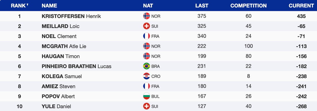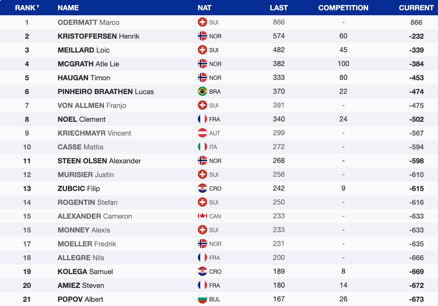 В генералното класиране за Световната купа лидер с 866 точки е победителят от вчерашното спускане във Венген Марко Одермат (Швейцария), втори на 232 пункта зад него е Кристоферсен, а тройката с пасив от 339 точки оформя Меяр. Алберт Попов е 21-ви със 167 пункта на своята сметка.