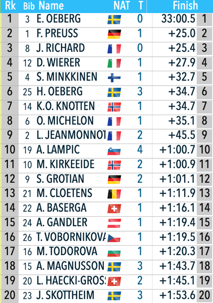 Йоберг стигна до победата след една перфектна стрелба, в която повали всичките си 20 мишени. Втора на 25.0 секунди зад нея остана Франциска Пройс (Германия), която допусна една грешка във втората стрелба от легнал, а тройката оформи Жан Ришар (Франция), която подобно на Йоберг беше безгрешна на рубежа.