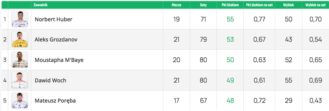 Лидер е полският национал от шампиона Ястрежебски Венгел - Норберт Хубер с 55 блокади.