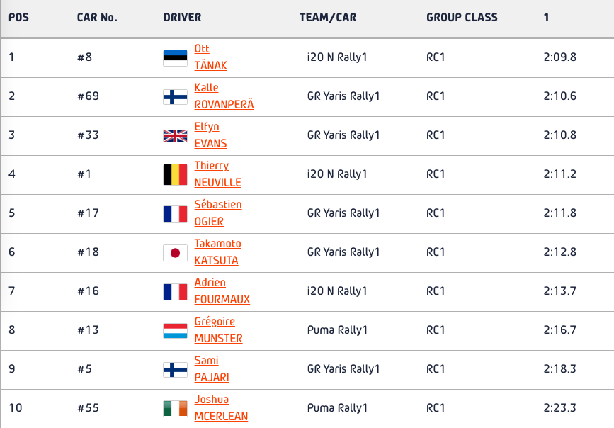 Новият пилот в редиците на Хюндай Адриен Фурмо заложи на сигурното в шейкдауна и даде време, което бе с 3.9 по-слабо от това на Танак. Челната десетка в края на първото минаване на шейкдауна оформиха Грегоар Мюнстер (М-Спорт), Сами Паяри (Тойота) и абсолютният дебютант в Rally1 Джош Макърлийн (М-Спорт), които изостанаха със съответно 6.9, 8.5 и 13.5 от Танак.