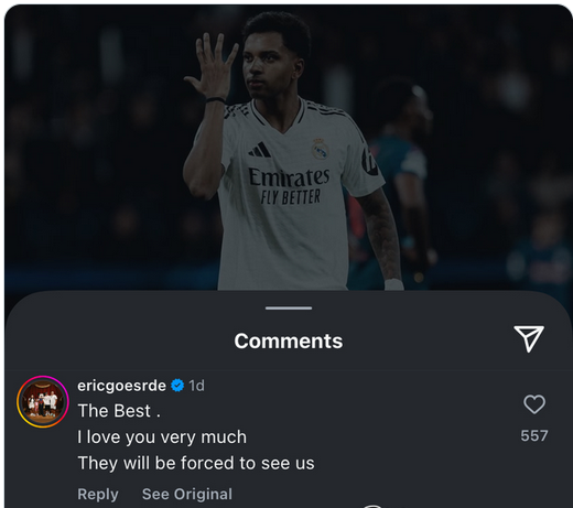 Силната игра на Родриго в последно време отново накара близките му да заговорят, че той е недооценен в Реал Мадрид. В коментар под негова публикация в Инстаграм баща му Ерик Гоеш написа: “Най-добрият. Обичам те толкова много. Ще се принудят да ни забележат”.