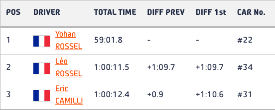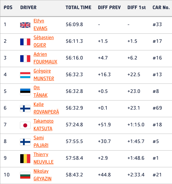 В общото подреждане уелският пилот на Тойота води с 1.5 секунди пред Господаря на Монте Себастиен Ожие, а тройката с пасив от 6.2 допълва Адриен Фурмо. Новият пилот в редиците на Хюндай записа първата си етапна победа с новия си тим в последната отсечка преди обедния сервиз.