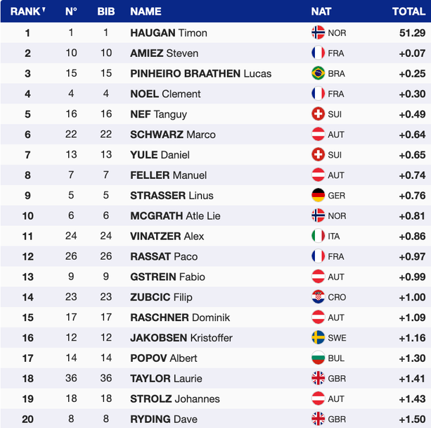 Втори, на 0.07 зад Хауген, се нареди представителят на Франция Стивън Амие, а тройката с пасив от 0.25 оформи състезаващият се за Бразилия Лукас Пинейро Бротен. Олимпийският шампион от Пекин 2022 Клеман Ноел (Франция) е четвърти на 0.30 от лидера, а швейцарецът Тангий Неф допълва челната петица с пасив от 0.49.