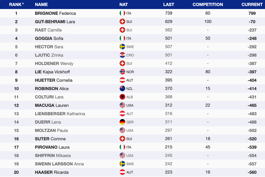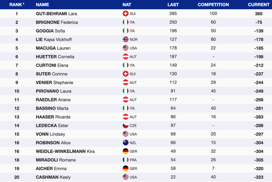 В генералното класиране за Световната купа водачка с актив от 799 точки и аванс от 70 е Бриньоне, а втора е днешната победителка Гут-Бехрами. Тройката с пасив от 237 пункта оформа специалистката в техничните дисциплини Камий Раст.