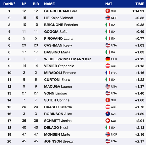 Впоследствие трите италианки бяха изпреварени и от Кайша Викхоф Лие от Норвегия, която зае второто място зад Гут-Бехрами. Норвежката беше с 0.03 по-бърза от Бриньоне, за да регистрира своя втори подиум за сезона, само осем дни след първото ѝ призово класиране за кампания в спускането в Кортина д'Ампецо.