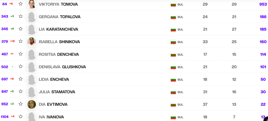 Втората ракета на страната Гергана Топалова бележи прогрес с три места и вече е 343-а, а Лия Каратанчева се изкачи до 345-о място.