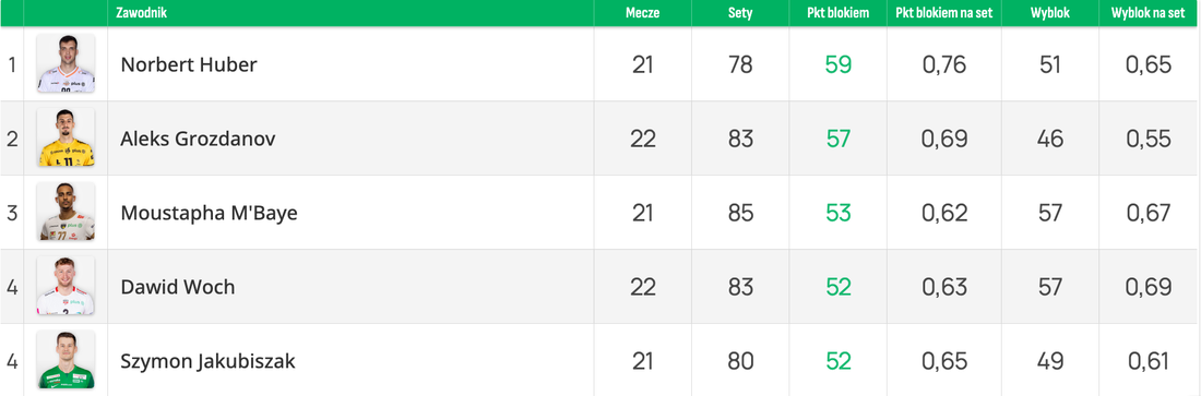 Лидер продължава да е полският национал и MVP на миналия шампионат Норберт Хубер от шампиона Ястрежебски Венгел (Ястжембие Здруй), който има в актива си 59 блокади.