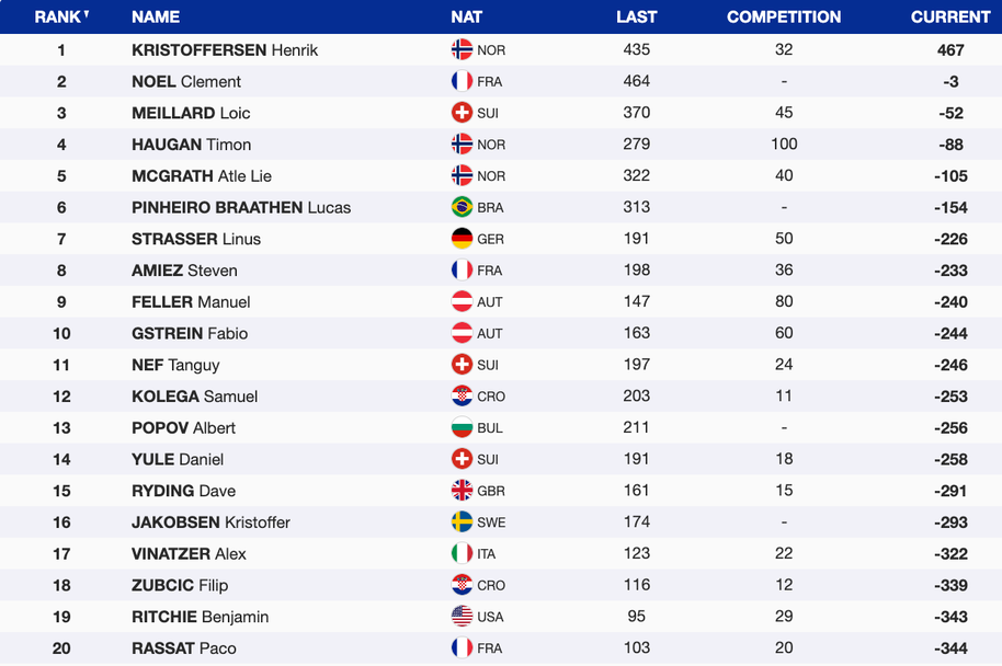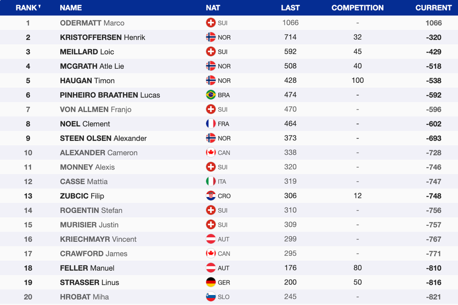 В генералното класиране за Световната купа начело с актив от 1066 точки и комфротен аванс от 320 пред Кристоферсен е Марко Одермат. Трети на 429 пункта зад лидера се движи Меяр, а Алберт е 29-ти с пасив от 855 точки.