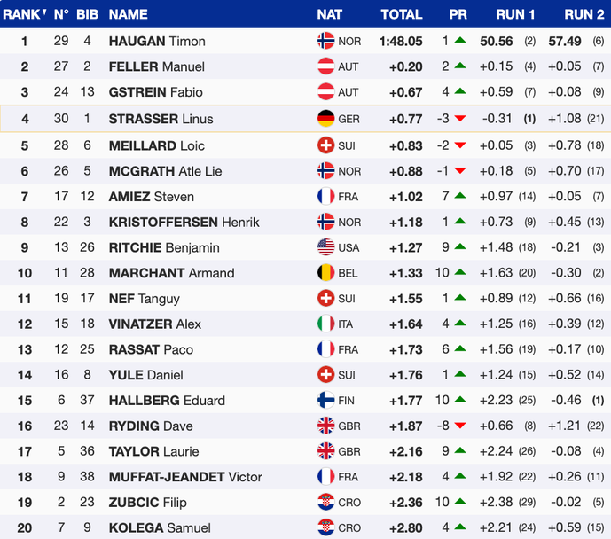 Победата днес грабна Тимон Хаугер, за когото това е втора победа през сезона след успеха му в слалома в Алта Бадия малко преди Коледа. Неговият успех означава, че Норвегия спечели и двете състезания в Шладминг през този сезон, след като вчера Александър Стеен Олсен триумфира в нощния гигантски слалом на „Планай“.