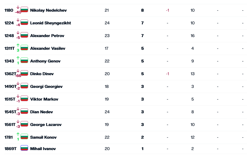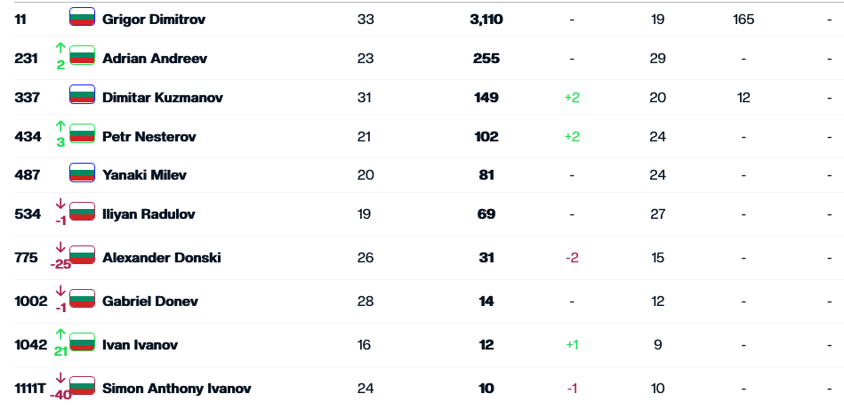 Втората ракета на България Адриан Андреев се изкачи с две места до №231 с 255 пункта на сметката му. При Димитър Кузманов няма промяна и той остава №337 със 149 точки. Пьотр Нестеров напредна с три позиции до №434 с актив от 102 точки, а Янаки Милев остава 487-и с 81 точки. Най-голям прогрес от българите през тази седмица осъществи Иван Иванов, който прескочи 21 места и вече е №1042 с 12 точки.
