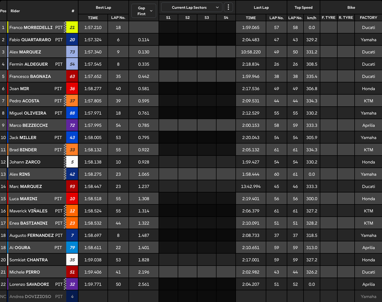 Късни бързи обиколки имаше и за Жоан Мир (Хонда) и Педро Акоста (КТМ), които завършиха деня съответно шести и седми. В челната десетка попаднаха още Мигел Оливейра (Прамак Ямаха), Марко Бедзеки (Априлия) и Джак Милър (Прамак Ямаха). Най-активен днес беше новобранецът в екипа на LCR Хонда Сомкиат Чантра, който навъртя общо 65 тура.