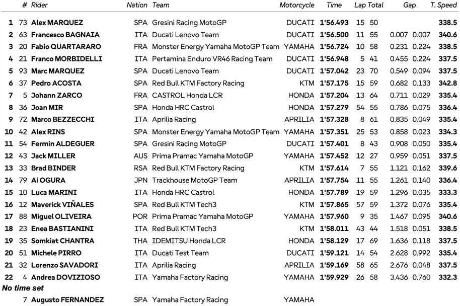 Франко Морбидели (VR46 Дукати), който бе най-бърз вчера, зае четвъртото място, а топ 5 допълни вторият заводски пилот на Дукати – Марк Маркес, който бе с 0.549 по-бавен от своя по-малък брат. В челната десетка място още намериха Педро Акоста (КТМ), Йоан Зарко (LCR Хонда), Марко Бедзеки (Априлия), Жоан Мир (Хонда) и Алекс Ринс (Ямаха).