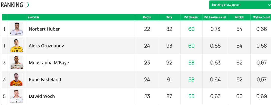 Лидер е полският национал с 0,66 блока средно на гейм.