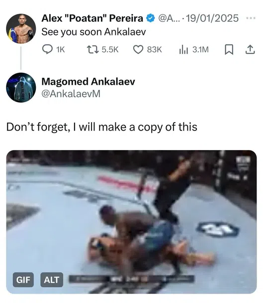 Анкалаев използва социалните мрежи, за да се “захапе” с Перейра за това, че бразилецът пътува до Сидни, за да бъде в ъгъла на Шон Стрикланд по време на битката му с Драйкъс Дю Плеси, вместо да тренира за битката помежду им.