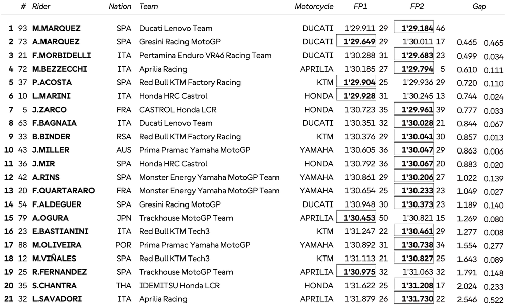 Тройката с пасив от 0.499 оформи Франко Морбидели (VR46 Дукати), който също като Марк Маркес записа най-доброто си време в заключителните моменти от деня. Четвърти се нареди Марко Бедзеки (Априлия), а петицата допълни Педро Акоста (КТМ), чието най-добро време беше записано в хода на сутрешната сесия.