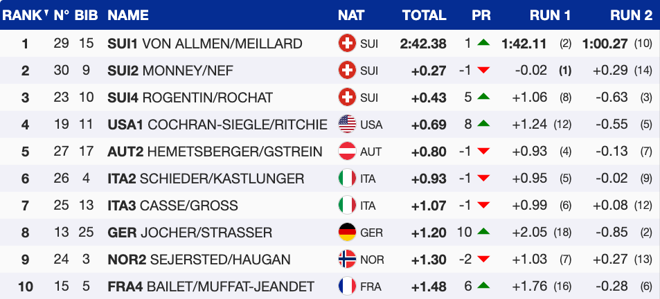 Днес златото грабнаха Фон Алмен и Лоик Меяр, които оформиха отбора на Швейцария 1. След спускането двамата бяха на второто място, но изоставаха със само 0.02 секунди от съотборниците си от Швейцария 2 (Алекси Моне/Тангий Неф).