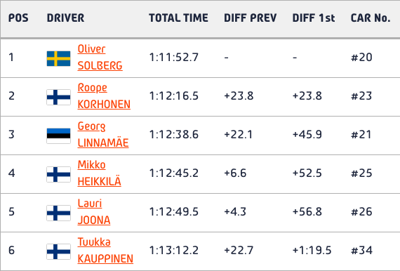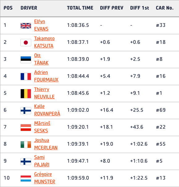 Четвърти и пети се движат Адриен Фурмо (Хюндай) и Нювил, които обаче изостават със само 7.9 и 9.1 от лидера. На 16.4 зад действащия световен шампион се движи двукратният световен първенец Кале Рованпера (Тойота), който през целия ден имаше проблеми с поведението на своя автомобил, но определено не бива да бъде отписван от битката за победата предвид сравнително малкия си пасив.