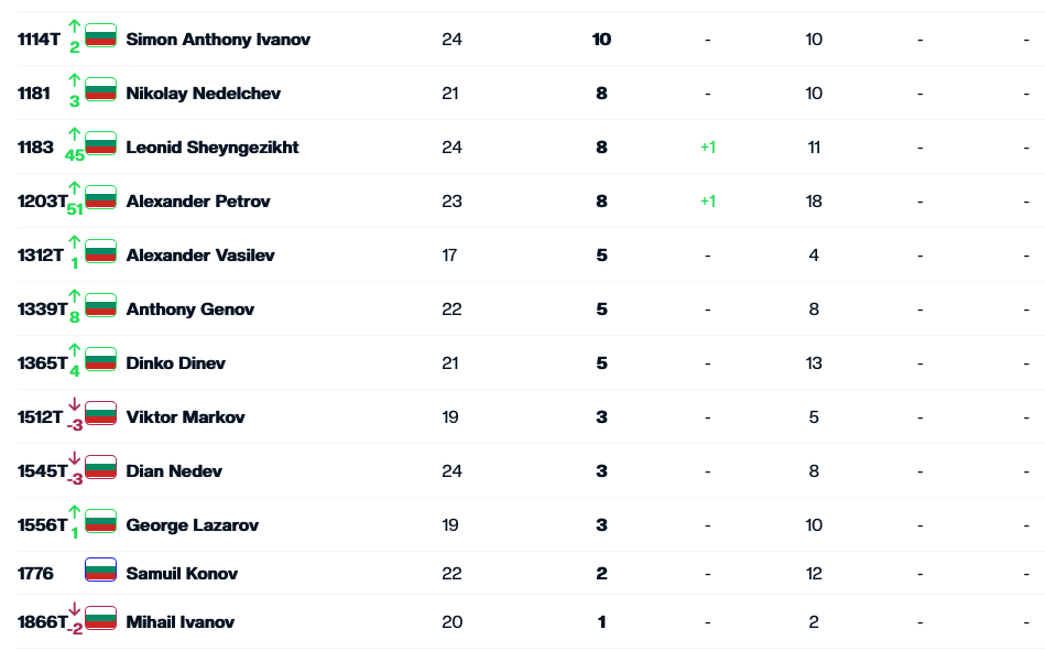 Добри новини има за Димитър Кузманов, който прогресира с 15 места до №345 със 144 пункта на сметката му.