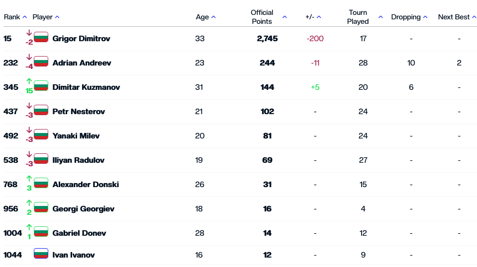 След като миналия понеделник Григор Димитров падна с две места в световната ранглиста, днес най-добрият български тенисист направи още две крачки назад и се смъкна до №15. Това е най-ниското класиране на хасковлията от 29 октомври 2023 година, когато той беше 17-и в подреждането.