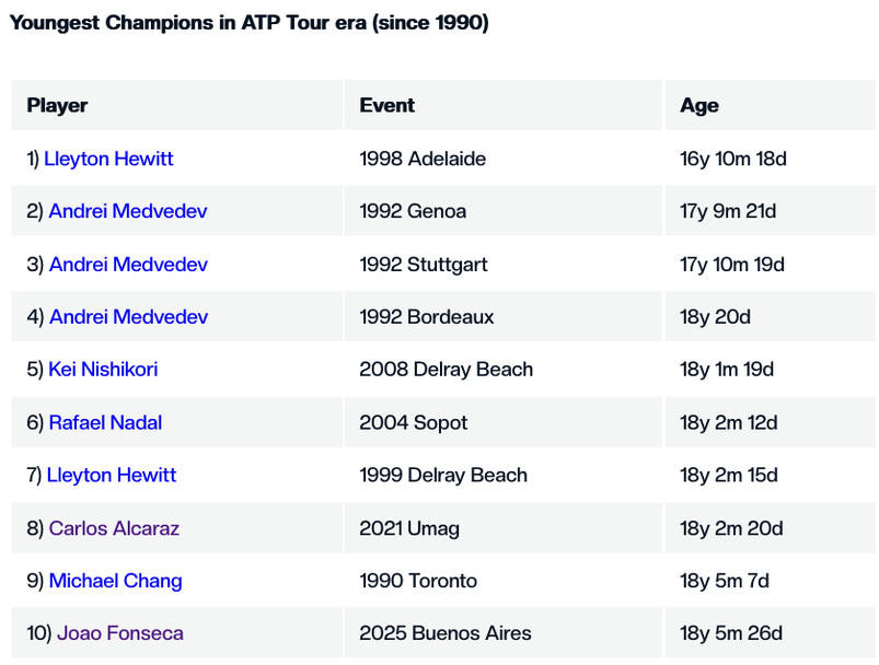 Преди една година Фонсека беше номер 648 в световната ранглиста. Той бележи страхотен възход през 52-те седмици оттогава и вече е №68, след като титлата в Буенос Айрес го изстреля с 31 места в сравнение с миналия понеделник. Тийнейджърът започна своя сезон 2025 на високо ниво, спечелвайки титла от турнир от сериите "Чалънджър", след това елиминира Андрей Рубльов на Откритото първенство на Австралия и сега взе първия си трофей от АТР.