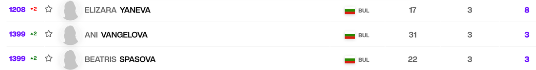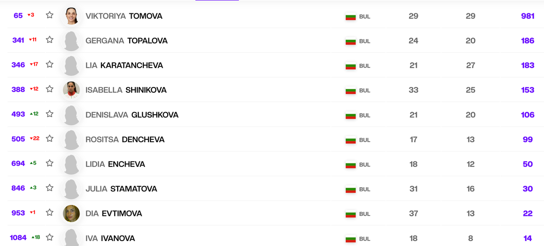 Отстъпление бележат и следващите три родни тенисистки в ранглистата. Гергана Топалова падна с 11 места до №341 със 186 пункта на сметката й, но тя върна статута си на втора ракета на България, след като Лия Каратанчева се срина със 17 позиции до №342 с актив от 183 точки. Изабелла Шиникова се смъкна с 12 места и вече е №388 със 153 точки.
