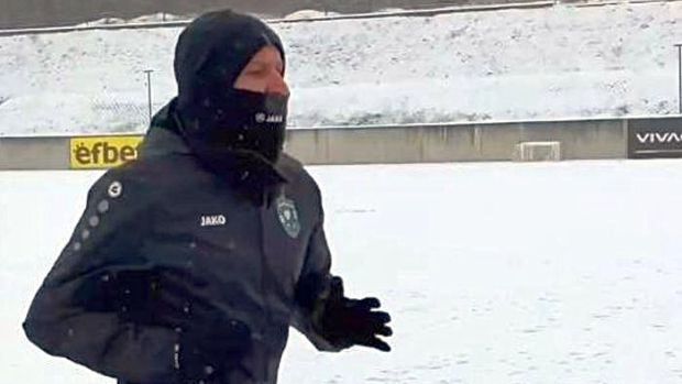 Бившият футболист на Ботев (Пловдив) проведе бегови упражнения на снега в Разград, където температурите бяха около минус 5 градуса.