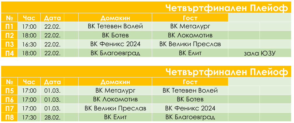 Плейофите в "А" НВГ започват още този уикенд (22 февруари), а двойките вече са ясни. Победителят ще бъде определен в две срещи на разменено гостуване. Полуфиналите са насрочени за 8 и 15 март, а големият финал ще се проведе в столичната зала "Христо Ботев" на 23 март (неделя) от 16,00 часа.