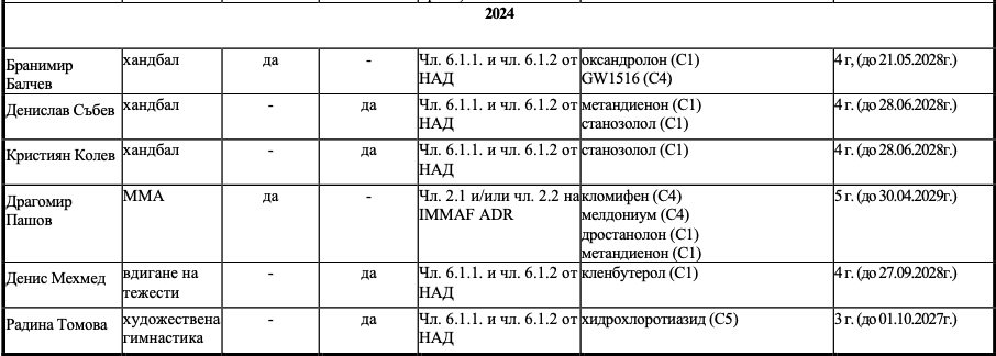 Преди нея в списъка на наказаните от Антидопинговия център за миналата година се появиха трима хандбалисти - Бранимир Балчев, Денислав Събев и Кристиян Колев, един състезател по ММА - Драгомир Пашов, и един щангист - Денис Мехмед.