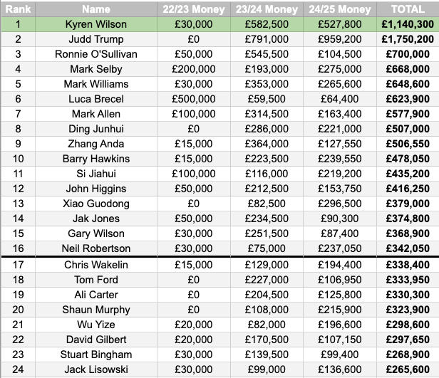 Робъртсън заслужи големия бонус от 150 000 паунда за лидерската си позиция в общото класиране на турнирите от т.нар. “Британски шлем”. Те обаче не важат за мястото му в световната ранглиста и затова позицията му в топ 16 е застрашена.