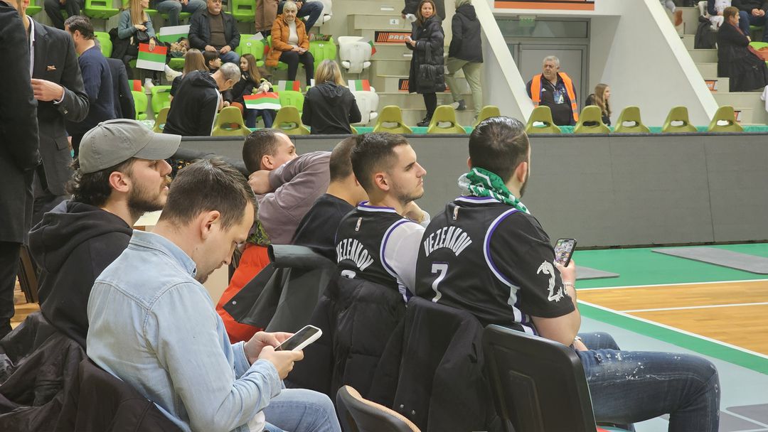 Освен с екипи на националния отбор, забелязахме и фенове заели местата си в залата, облечени с потници на Везенков от престоя му в НБА.