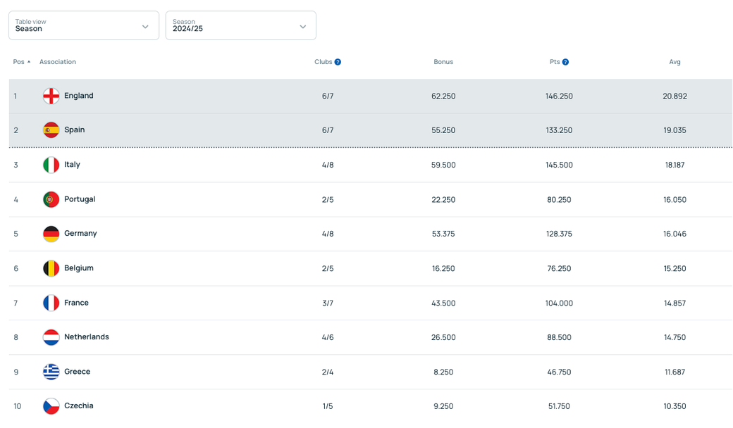 Английската Премиър лийг остава убедителен лидер в класацията със своя коефициент от 20,892 и цели шест останали отбора от общо седем в европейските клубни турнири. След плейофния кръг в ШЛ, Лига Европа и Лига на конференциите испанското първенство увеличи преднината си спрямо Серия "А". Ла Лига вече има коефициент от 19,035, като остава с шест тима от седем възможни в трите турнира. За сметка на това, след изненадващите отпадания на Милан, Аталанта и Ювентус от ШЛ, италианският елит остана без половината си евроучастници. Така Калчото в момента е с четири клуба от общо осем и коефициент от 18,187. Топ 10 се допълва от първенствата на Португалия, Германия, Белгия, Франция, Нидерландия, Гърция и Чехия, но всички те са твърде далеч от първите две места, които дават право на допълнителна квота в следващия сезон на Шампионската лига.
