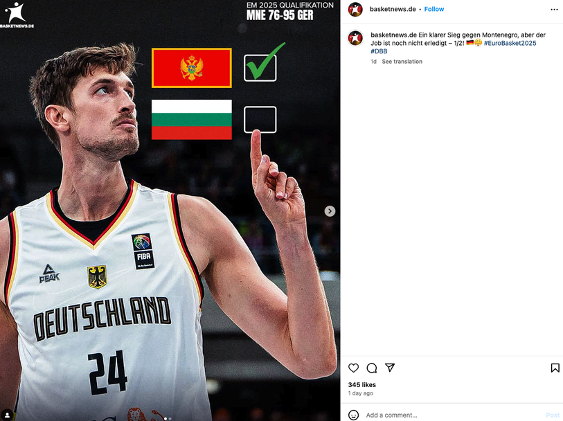 В един от най-популярните баскетболни профили за новини в Германия се появи колаж, в който играч на тима посочва българското знаме като следващата задача за отмятане, след като Бундестима победи Черна гора.