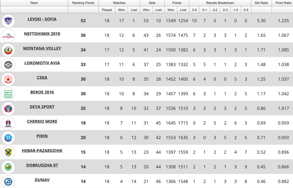Берое е 6-и с 30 точки (10 победи, 8 загуби).