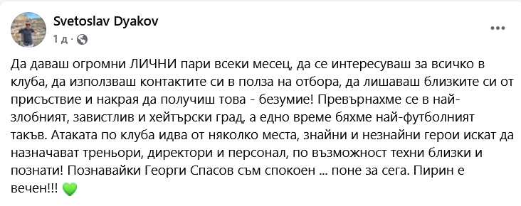 "Да даваш огромни лични пари всеки месец, да се интересуваш за всичко в клуба, да използваш контактите си в полза на отбора, да лишават близките си от присъствие и накрая да получиш това - безумие! Превърнахме се в най-злобния, завистлив и хейтърски град, а едно време бяхме най-футболният такъв. Атаката по клуба идва от няколко места, знайни и незнайни герои искат да назначават треньори, директори и персонал, по възможност от техни близки и познати! Познавайки Георги Спасов, съм спокоен... поне засега. Пирин е вечен!", написа Дяков в една от социалните мрежи.