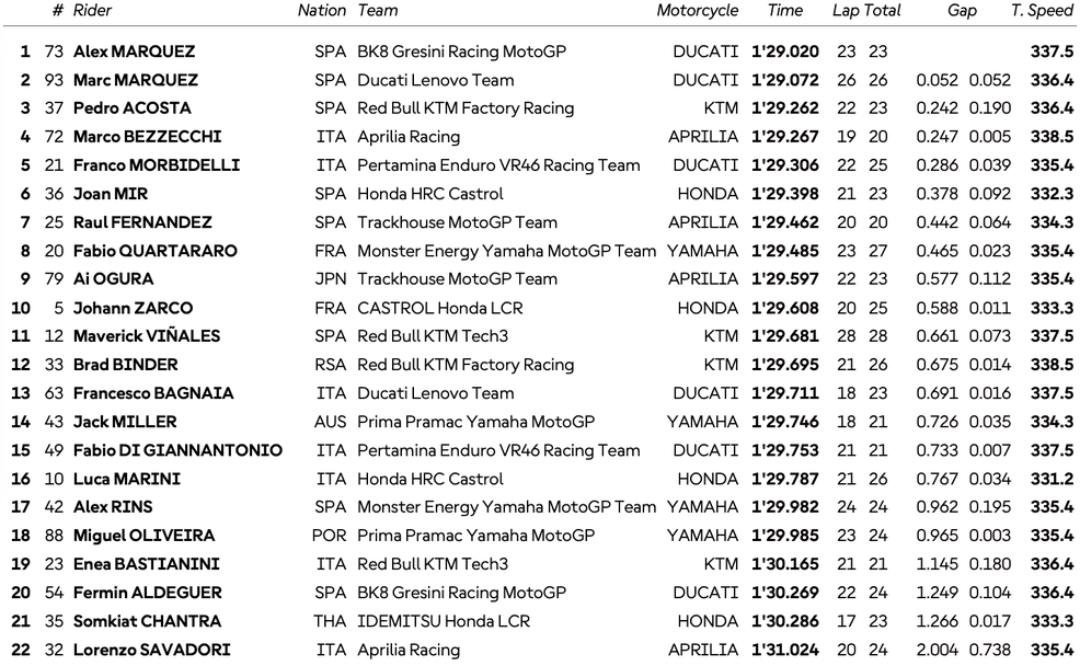 В самия край на тренировката пилотът на Грезини Дукати завъртя обиколка за 1:29.020, с която победи с 0.052 секунди своя брат. Тройката с пасив от 0.242 оформи Педро Акоста от КТМ, а в топ 5 влязоха още Марко Бедзеки (Априлия) и Франко Морбидели (VR46 Дукати).