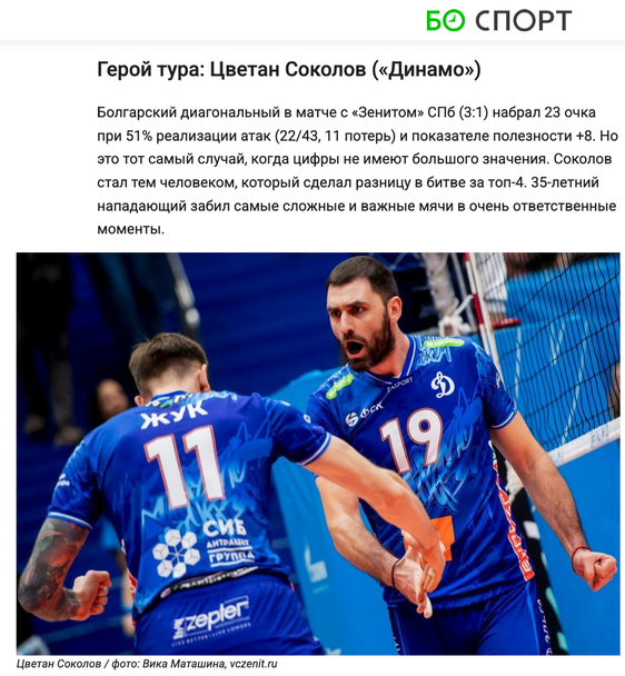 “Соколов реализира 22 от 43 атаки, при 11 грешки. Но това е от тези случаи, когато цифрите нямат толкова голямо значение. Соколов стана човека, който направи разликата в битката за Топ 4. З5-годишният диагонал заби най-сложните и важни точки в мача в най-отговорните моменти. Той бе добър в решаващите финални части на геймовете и стана абсолютен лидер по брейк точки - 12. веднага след като съперниците не успяваха да завършват топката в атака, той ги наказваше с контраатака. Във втория гейм резултатът от 18:19 стана 24:19 след начални удари на Цветан Соколов. Първо Цветан Соколов завърши 3 пъти поред, а след това Зенит сгреши. не е изненадващо, че в четвъртия гейм старши треньорът на Зенит Владимир Алекно даде Цветан Соколов за пример на своя диагонал Владислав Бабкевич, на който играта в този мач не се получи”, написаха от “БО спорт”.
