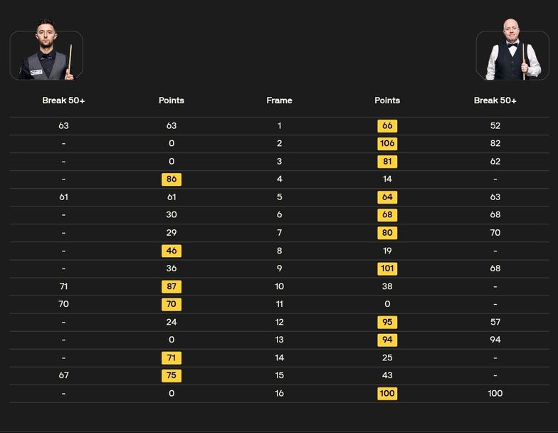 Вълшебника от Уишоу прибра накуп 175 000 паунда от рекордния награден фонд, като вече има 32 ранкинг трофея на сметката си (от 57 финала). Последният му такъв успех преди днес беше през 2021-ва в Шампионата на играчите. Оттогава Хигинс беше натрупал разочарования като това в Шампионата на тура през 2022-ра, когато от 9:4 загуби с 9:10 от Нийл Робъртсън.