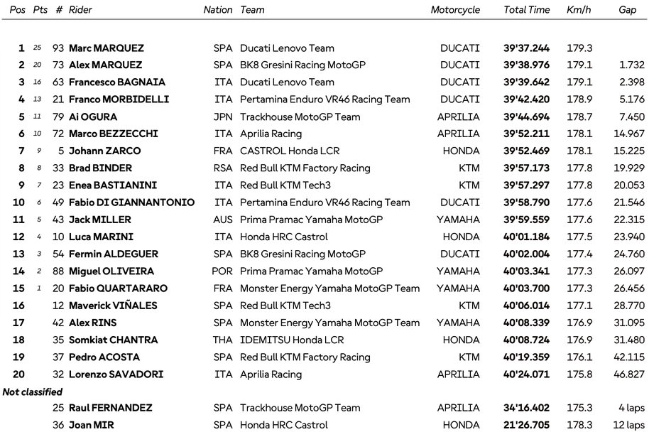 21/26 - Грешка на Алекс Маркес на изхода от предпоследния завой, която отвори леко вратата пред Марк Маркес в спирането за финалната крива, но заводският пилот на Дукати не успя да се възползва.
