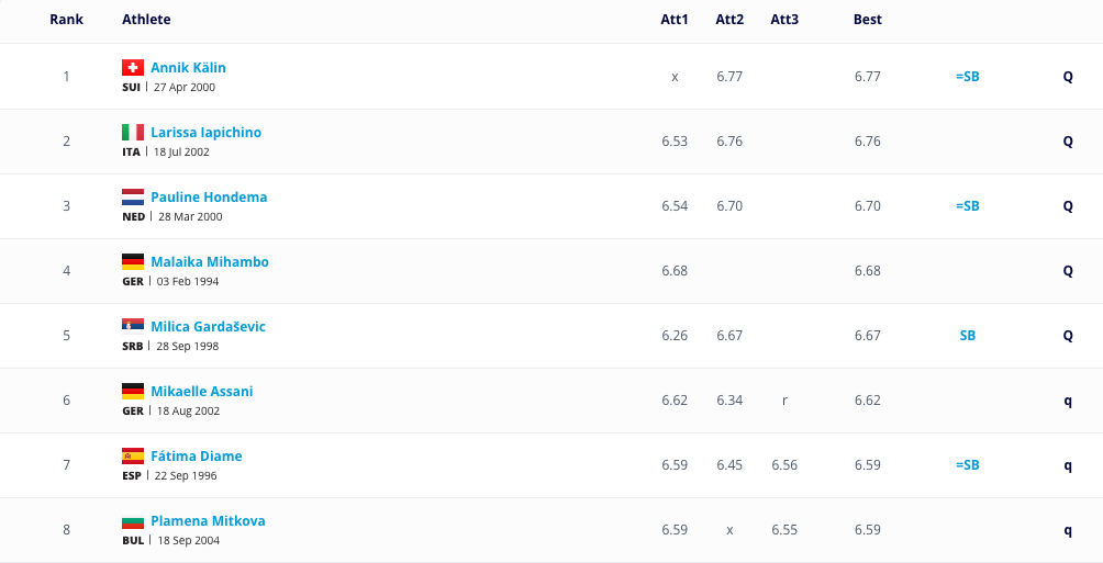 Квалификацията в Апелдорн спечели швейцарката Аник Келин с личен резултат за сезона от 6.77 метра. След нея се наредиха Лариса Япичино с 6.76, Полин Хондема с 6.70, Малайка Михамбо с 6.68, Милица Гардашевич с 6.67, Микаеле Асани с 6.62, Диаме и Миткова.