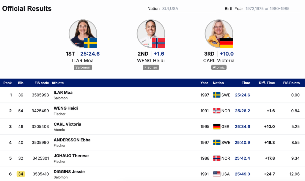 Карл беше трета, както и на 20 км в събота, докато трикратната световна шампионка Ебба Андерсон от Швеция и победителката от събота Терезе Йохауг от Норвегия пропуснаха подиума, след като заеха съответно четвърто и пето място.