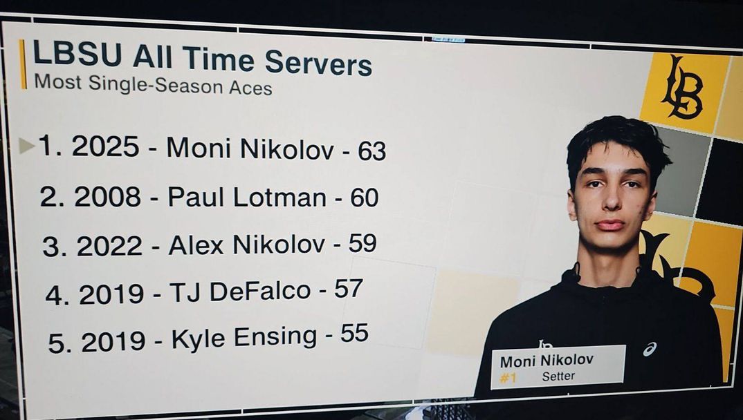 Последните 7 аса изкачиха Симеон Николов до №1 по този показател за волейболистите играли за Лонг Бийч за всички времена със 63 аса.