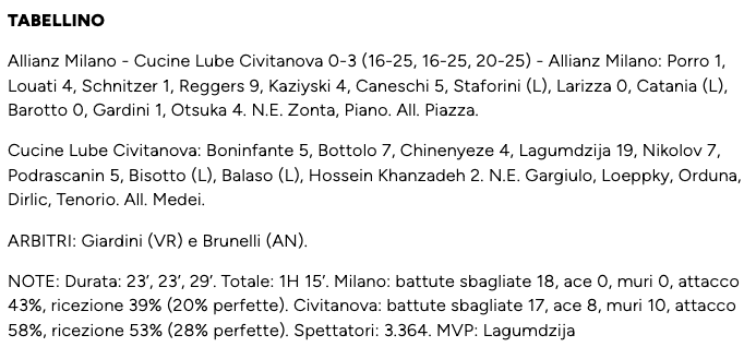 Над всички за Лубе бе турският диагонал Адис Лагумджия със страхотните 19 точки (1 блок, 2 аса и 73% ефективност в атака - +15) за победата.
